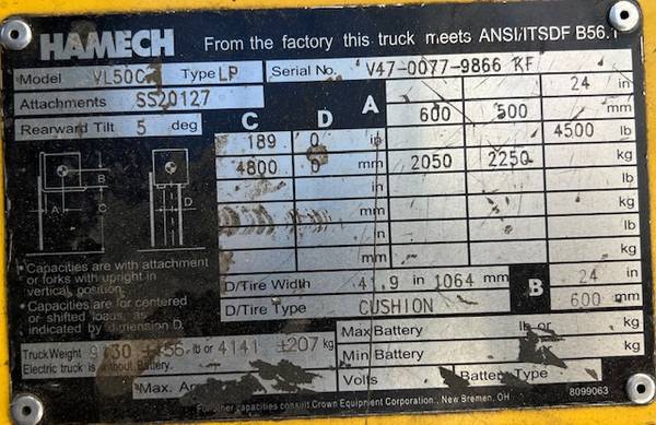 #29209 2011 HAMEC 5000LB CUSHION TIRE FORKLIFT, 3 STAGE, SIDE SHIFT, PROPANE POWER