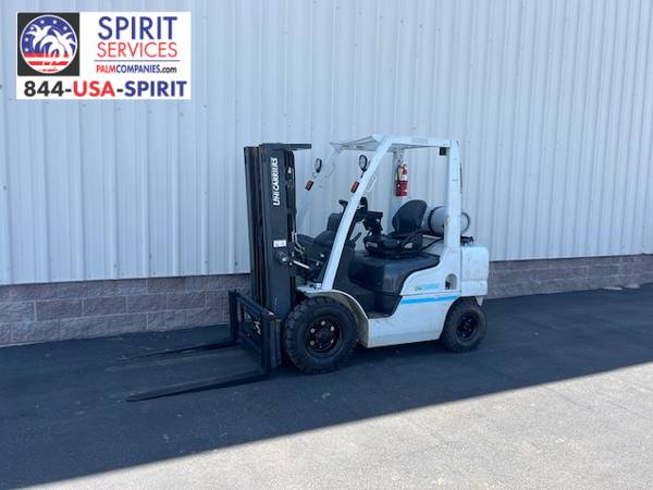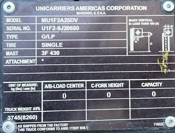 #29187 2018 UNICARRIER, PF50, 5000 LB PNEUMATIC TIRE FORKLIFT, 3 STAGE, SIDE SHIFT, PROPANE POWER