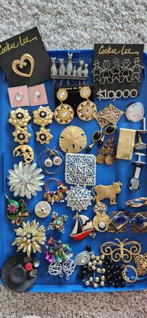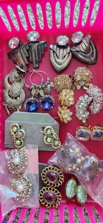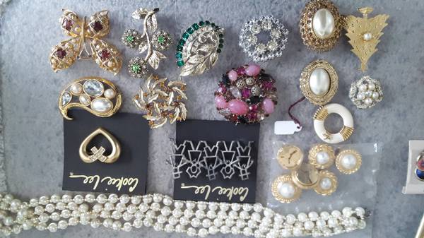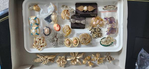 Lots of beautiful pieces of costume jewelry. Some pins, clip on earrings, misc. Most are vintage. Great for craft projects, like a framed Xmas tree, or to wear. 2 strings of crystal like beads also....
