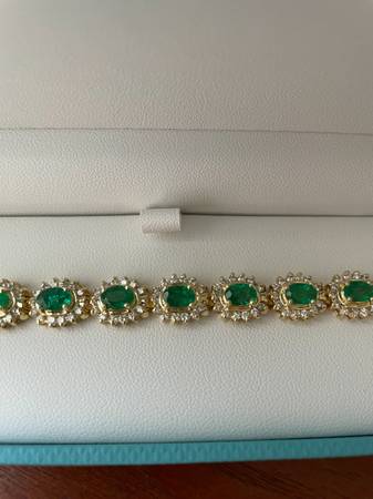 LADIES CUSTOM DIAMOND AND RUBY 14KT BRACELET THERE ARE 7.7 CARATS OF EMERALDS AND 3 CARATS OF ROUND DIAMONDS ALL SET IN 14KT YELLOW GOLD BRACELET IS 7 INCHES LONG AND HAS 23.5 GRAMS GOLD