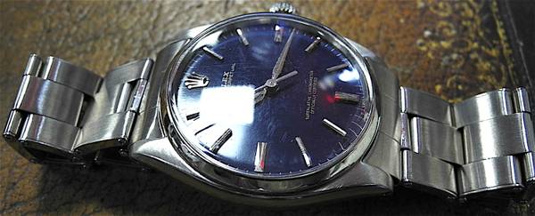 Original Rolex Oyster Perpetual Ref. 1002 in stainless steel measures 34mm in diameter not including the setting crown. The serial number dates this watch to 1963 Watch has a spectacular blue dial perfectly restored with steel hands and hour markers. The Rolex movement is automatic and has been serviced and is working perfectly. The original Rolex stainless steel riveted Oyster band is in good condition, would consider a possible trade for other vintage watches, not working, incomplete, even rusted parts and pieces, case parts or complete. Have no problem with quartz watches too. There is no box or papers with this watch. I am a watch repairer and am happy to repair any watch that needs attention.