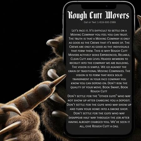 Keeping it Classy San Diego? We are the Rough Cutt Crew! San Diego's Finest Furniture Moving Professionals. Call or Text to Book us with our "Move Now!" service and we'll collect a couple of details and send out Two Expert Movers and a Truck. Quick, Simple and Efficient. Don't hire Tweedle Dee and Tweedle Dumb off of Craigslist. Book with trusted San Diego Natives with Reviews all across the web. Professional Residential and Commercial Moving Company filled with crews with over 11 years of experience. We are 10 Months in having created this BEAST of a Company and growing like a tumor. Check us out on
