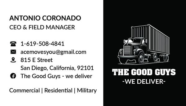 The Good Guys!!!Call: CEO Antonio Coronado 1-619-508-4841 and or Sale & field Operations Manager: Henry Underwood 619-547-2921 call for free quotes! LONG DISTANCE SPECIALIST! SHORT NOTICE OK! SMALL MOVES OK!