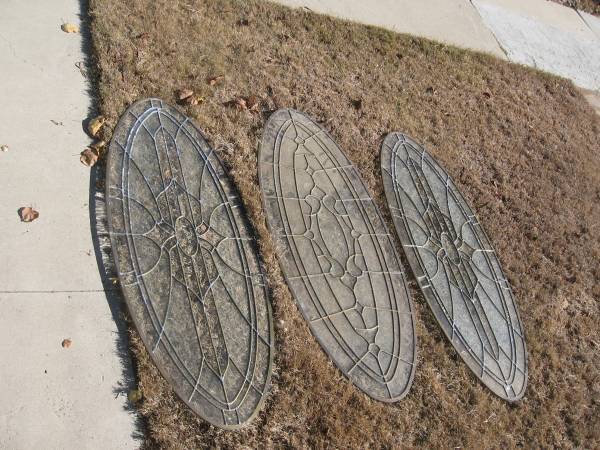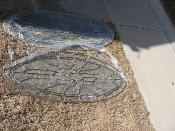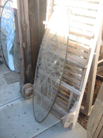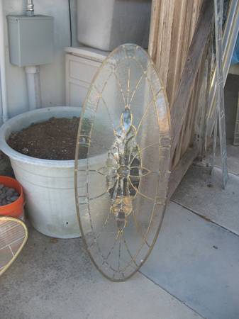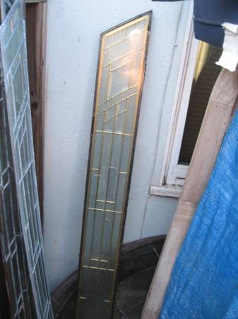 PRICES are $85.00 EACH and UP---could be used for a variety of purposes. door or window inserts. some side lights, half moon and a bunch of single pane stained glass. a couple of the half moon pieces have cracks and are over 60'' in width+28'' tall-prices vary leave a call back number if interested for pricing/ questions. most ovals are 48'' wide x 20'' tall-one bigger one and a few smaller ones.---$85.00 and up----pic #13 has five pieces from left to right--- #1---triple pane---9'' wide x 49.25'' tall---#2---SOLD---# 3--- has a curved top---11'' wide x 39.25'' tall---#4---SOLD---#5---45 degree top-54.5'' tall x 6.5'' wide.--- pic # 12 is a triple pane with a 45 degree top-64'' tall x 6.75'' wide. Pic. 13+14 single pane-measures 21.75 wide x 37.25'' tall--- when asking price mention pic number---if interested leave a call back number for quicker response---