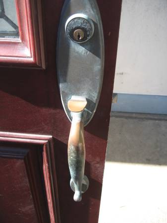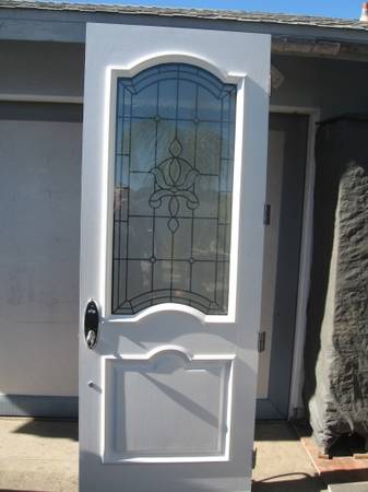 Beautiful solid wood exterior front door with a large triple pane stained glass insert. Measures 94.5'' tall x 35.75'' wide x 1.75'' thick. This is a solid heavy door that was custom made. Has four heavy duty hinges. The cost when new was over $3000.00. Is in amazing condition like new. Standing outside door handle is on the right and door swings in. Comes with solid brass door handle valued at $550.00 alone. If interested leave a call back number for quicker response---