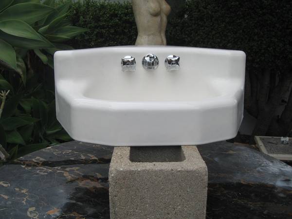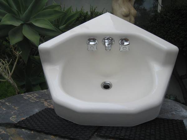 Slightly used for one year, removed for a remodel. Is almost perfect, these list for over 1k new. Constructed of KOHLER Cast Iron model # K-2766-EH-0, the Marston wall-mount corner bathroom sink lavatory is both functional and durable, making it ideal for high-volume usage in a commercial setting. This model is for space-saving corner installations, features a 5-1/2" center drilling and a shelf at the back adds convenience. Comes with chrome triton fixture which lists for $325.00 alone. Measurements the from inside corner out on both sides against the wall is 16''. Corner to front center is 21''. Have one wall bracket for mounting to wall. Two are needed it's available for $15.00 on Amazon-Kohler wall bracket #64503-10---if interested leave a call back number for quicker response---