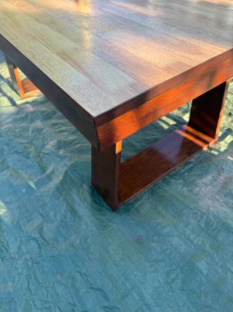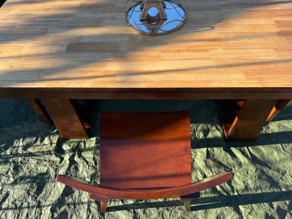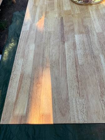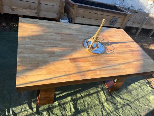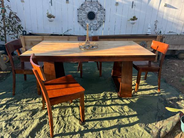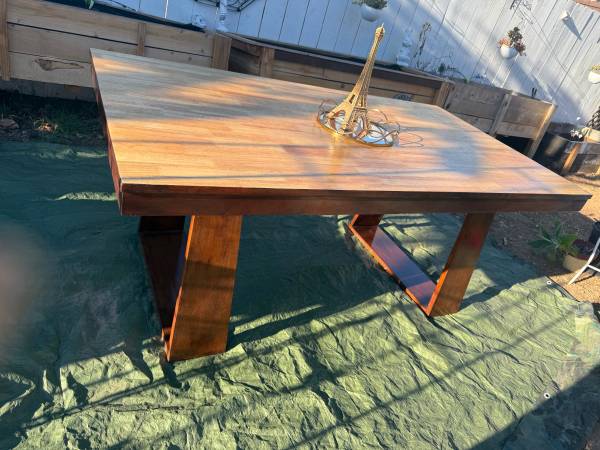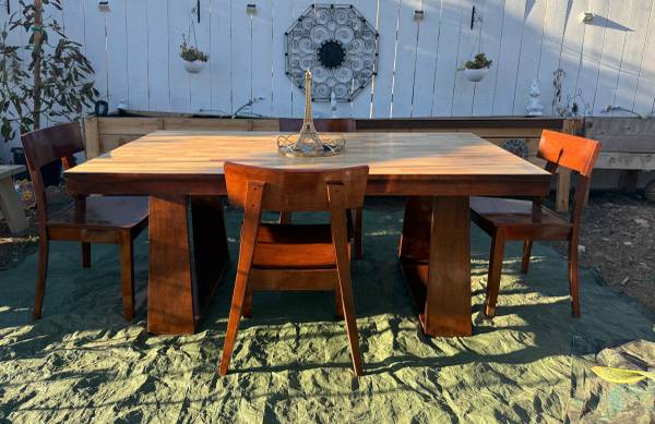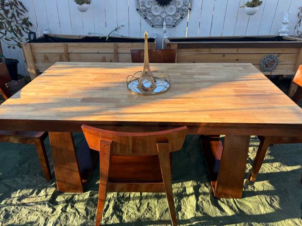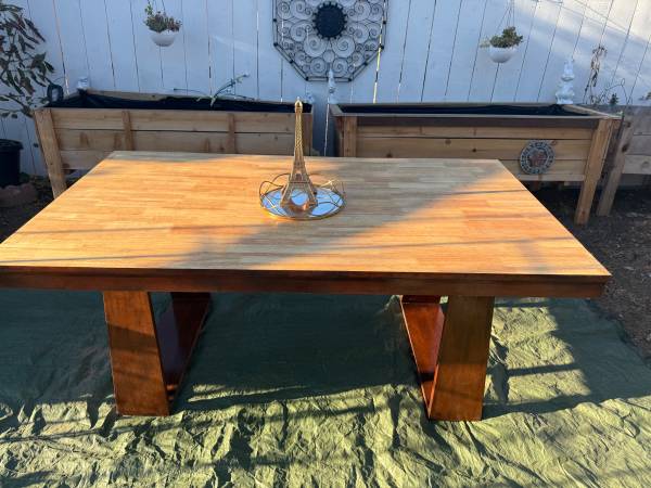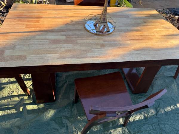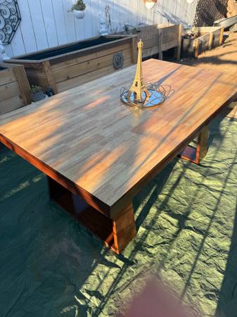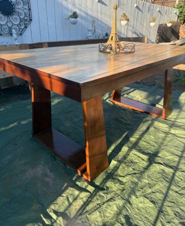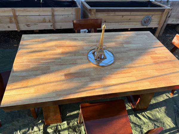 Modern style/barn large wooden dinning set color brown /cinnamon and natural color set has been refurbished looks almost new Completely clean top of the table no water marks looks new color natural...