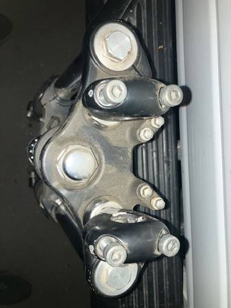 This is a complete front fork assembly for a late model Triumph Bonneville T100 from 2011 through 2016. I was told by the Triumph mechanic that, aside from the top triple tree clamp, the forks are interchangeable. It is the single disc brake version and comes with the fork legs, fork tubes, fork boots, all internals, upper and lower fork clamps, bearings, and handlebar clamps. It is a 'plug and play' assembly, ready to be bolted onto your Triumph or custom build. Selling it for $350.