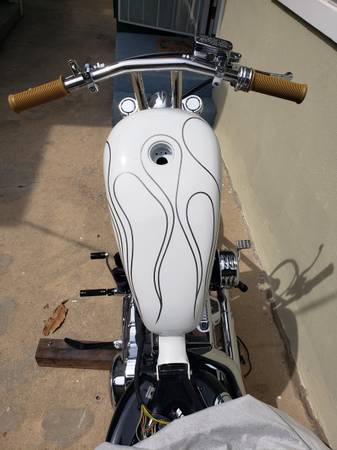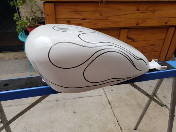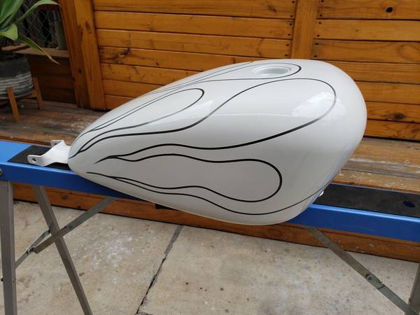 Tank has been painted Pure gloss white with charcoal pinstripe flames. Tank has an epoxy liner installed. This is for EFI bikes so it will fit any sportster 2007 and up but can easily be converted with an adapter plate to run a petcock for older bikes.