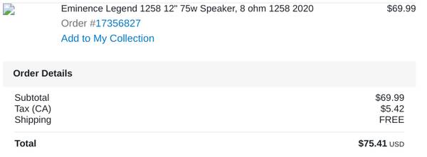Upgraded installed Eminence Legend 1258 12" 75w Speaker, 8 ohm
