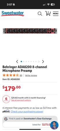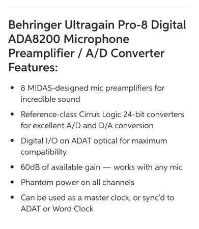 Behringer Ultragain Pro-8 Digital ADA8200 Microphone Preamplifier / A/D Converter Features: