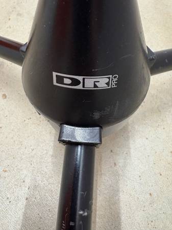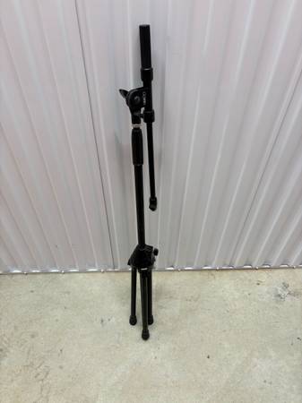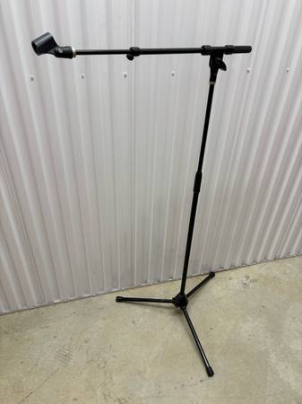 Black metal 5/8” thread mount telescoping boom microphone stand by DR PRO, model DR210. Professional-grade, comes with microphone clip attachment.