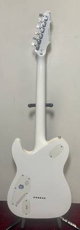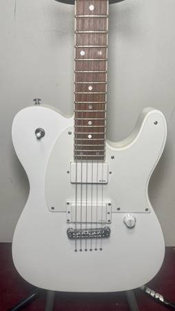 Made in 2018, this guitar has a beautiful "white on white" design aesthetic with a Snow White finish, white binding, white controls, and white covers on its EMG 60 (neck) and EMG 81 (bridge) pickups.