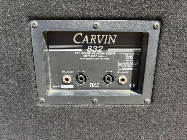 2 Carvin 832 PA Speakers: 400-watt, 15-inch, passive PA speaker with an 8-ohm impedance. Key features include a ported enclosure, a 15-inch woofer for bass, a radial horn for treble, and durable construction. It can be used for indoor or outdoor events, clubs, or schools, and has inputs for two 1/4" TS and two Speakon connectors.