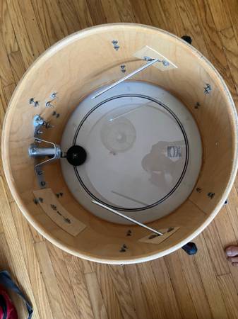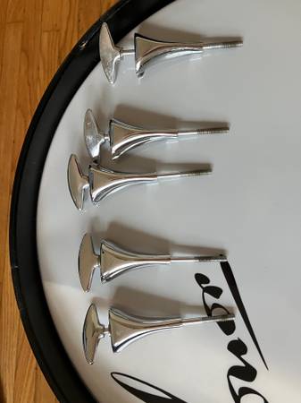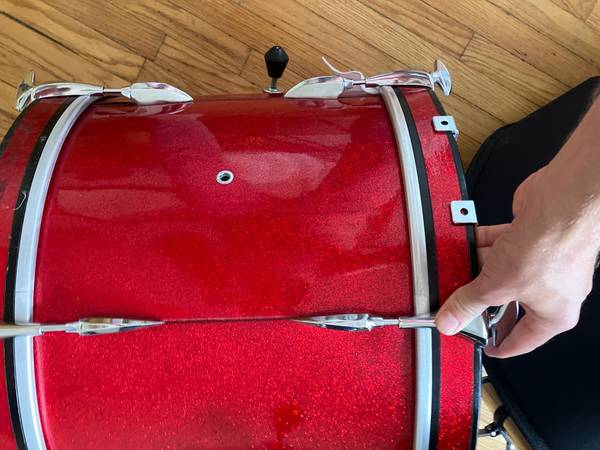 Some details: Modern heads fit fine. All original hoops, lugs and legs. As you can see, the chrome is especially good for its age. I've had many Sonor vintage Teardrop kits and the chrome is by far the best on this particular kit The wrap looks great, as you can see, but is not perfect. There's one spot on the 16 that needs a little glue. Easy fix if you're inclined. the bass looks great and the 13 is practically perfect. I use a snare stand for the 13 but I'm looking for the tom arm and will include it if I find it. I will include a bass drum anchor. I spent a bunch of money re-heading them. Coated Ambassadors top and bottom and Powerstroke on bass drum batter. I will include a soft case for the 13 as well as the 16. All mufflers function although they are a little stiff.