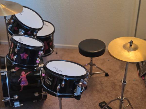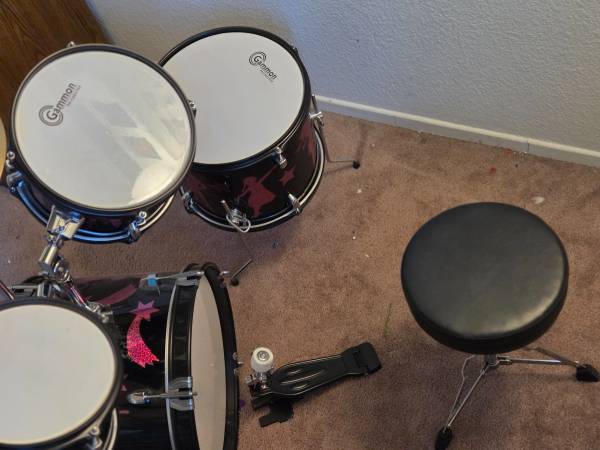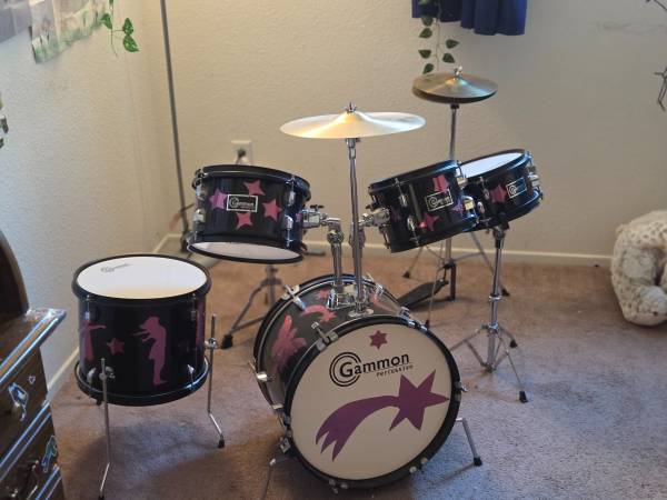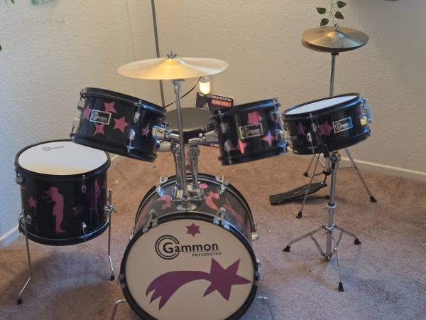 Gammon Percussion 5-Piece Junior Starter Drum Kit Drum set includes: (1) 16" - Bass Drum, (1) Snare Drum, (2) Mounted Toms, (1) Floor Tom, (1) Hi-Hat Cymbals, and (1) Crash Cymbal. A snare stand,...