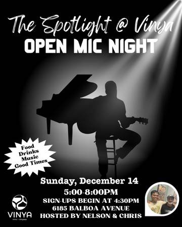 Next open mic at Vinya Restaurant and Wine Bar in Clairemont Mesa will be Sunday December 14th at 5pm (sign-ups at 4:30pm). Take the spotlight on our stage that can accommodate any setup, show us your skills on our acoustic grand piano, or simply enjoy the performers while dining at our restaurant and wine bar! We are open to musicians, poets, comedians, etc. The open mic starts at 5pm and sign-ups start at 4:30pm. Hope to see you there!
