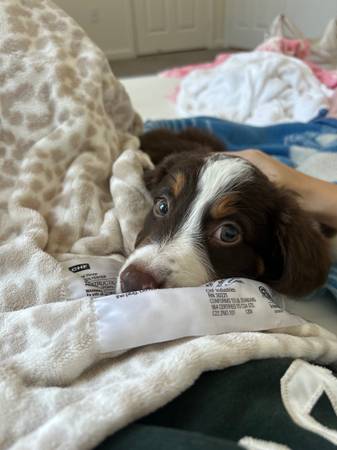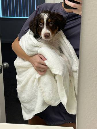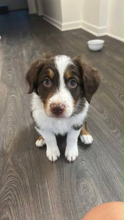 8 week old Australian shepherd boy puppy in need of a good loving home, small rehoming fee. Message me for more info. He has his first set of shots I will give u the paperwork.