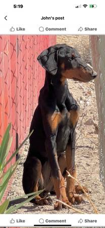 Found her in whitewater desert wandering. Can't imagine the backstory to what happened. I decided to keep her but the current dog living here is a bit of a jerk. Small dog syndrome. Fights have been happening. Not her fault. Not really his. I have paid for 5 training sessions and vets gave her a clean bill health with all shots. Not neutered yet. She is an amazing Doberman. Smart, sweet goofy. Good with cats. Has a bit of dog reaction in a leash but has made tremendous improvements with training. She needs 1/2 hour exercise daily. Something I'm not up to giving her consistently. Good family dog. Natural protective instincts. Loves cuddles and being by your side.