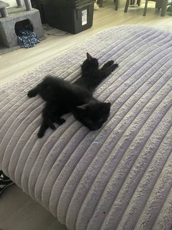 3 Very sweet black kittens who need good homes, about 12 weeks old, using litterbox and eating dry food. There are two boys and one girl, and there is a $75 rehoming fee