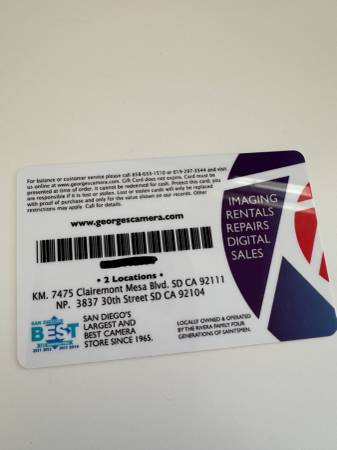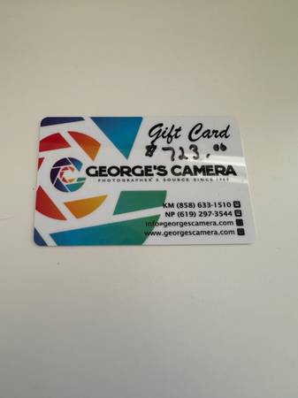 Hey! I'm selling my gift card to George’s Camera, it's for $723.00 — valid at both the North Park and Kearny Mesa locations. I'm selling for $600.