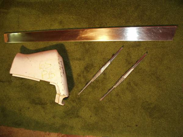 OBO. Perfectly straight, rust-free and ding-free right hand pot metal quarter panel "fender" extension piece from a '65 Bonneville. Probably the same as Catalina and GP, not entirely sure. I've had this stored away for over 35 years. This is constructed out of quality stainless steel, and is about 3' long and 3" wide (longest, widest points). I also have many other little pieces for a '65 or '66 full-size Pontiac (including vent wings and door glass). Many pieces of chrome.
