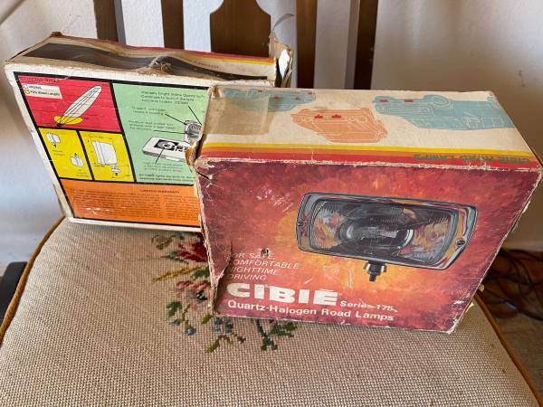 TWO Classic French brand CIBIE rally car and off road truck, light kit set. Model 175 series units. Clear fog pattern glass lenses. Hard plastic snap-on covers for street. Glass lens unit measures 9” wide x 5.25” high x 3.5” deep. Gray and chrome metal finish. Universal mount bolt. Cardboard boxes are worn. Lights are new. Never installed. Made in France. Some of their lights are made elsewhere. Kit includes fuse, yellow wire roll, switch with panel. Just missing instruction sheet for now. The 1981 Toyota truck shown in 1987 picture is with 4 other round CIBIE Oscar series lights Please text questions or comments. UTC area. USA cash only. Thank you