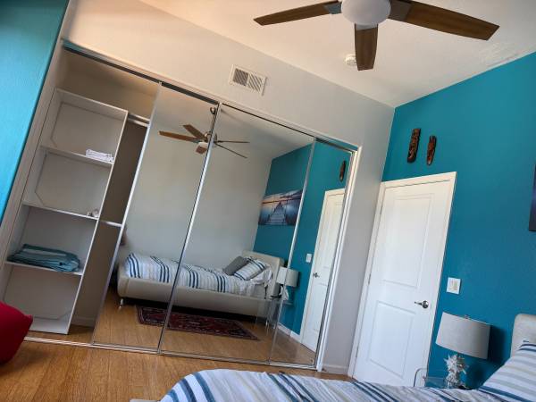 Fully furnished, high-quality furniture: White Leather bed, Tempur-Pedic Queen mattress, 55" TV w/ Bluetooth sound bar, 6-drawer dresser, Nightstand and lamp, Beautiful Napoleon antique Desk from France and lamp, blackout curtains, tinted privacy window. Huge, mirrored sliding 3-door closet//////!! If you have a lot of clothes, this is heaven! The room offers a lot of storage to keep the space neat! Mission Hills and Hillcrest neighborhoods offer the best of restaurants, bars, an impressive 95 walking score!