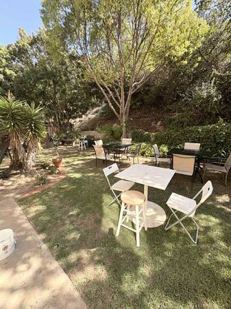 The house has a a big backyard with a BBQ and patio furniture.