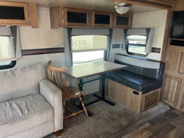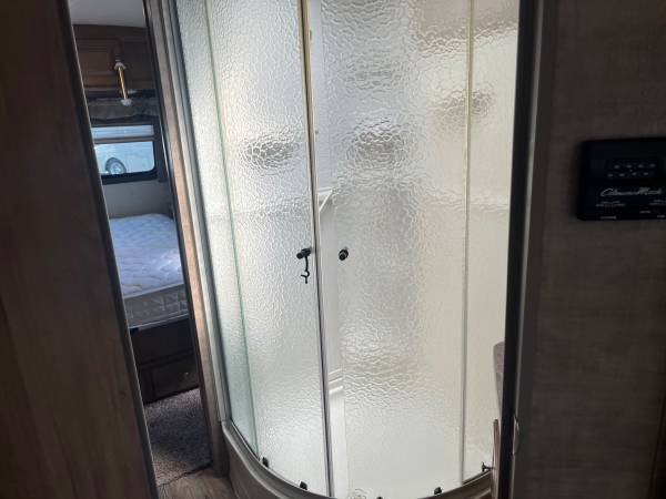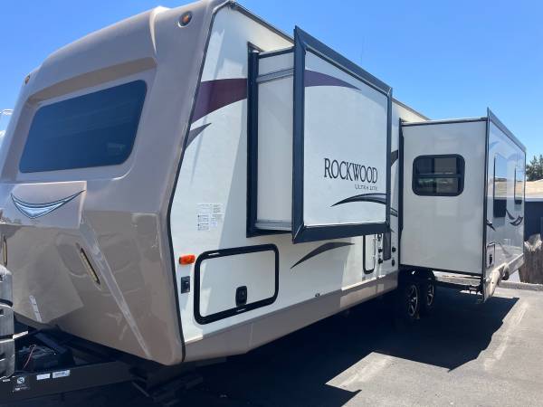 The Rockwood line is top quality, built with a fiberglass front clip, 28’, 2 entry doors, 2 slide outs, bedroom slide is a closet, queen bed, glass enclosure shower, large living room and open kitchen, 13500 btu ac, heater, power awning. Perfect for traveling or livable.
