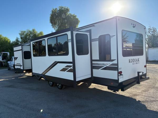 Hi I Am Selling A 2021 Dutchmen Kodiak 32Ft Travel Trailer With 3 Slide outs Blow-through Storage Electric Hitch Electric Jacks Electric Awning Outside Entertainment Center New Batteries Double Sofa Sleeper Front King Walk Around Bedroom Sleeps 6 People Comfortably Dinette Sett With A Large Walk In Closet Fireplace And Tv With A Pantry Behind it Full Kitchen With A Large Sink 3 Burner Stove Oven&Microwave Refrigerator Full Restroom With A Stand Up Shower Cold A/C And Heater Am/Fm Radio Clean Ca Title Asking $23,900 Call Or text for more info (909) 760-9021