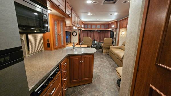 350HP air ride suspension allison six speed transmission, automatic power leveling jack system, back up camera, generator, power outside awnings, basement Storage, outdoor entertainment system, full body paint, high quality, luxury Coach, spacious luxurious floorplan, leather interior power sofa bed sleeper, full kitchen stainless steel appliances, full bathroom, large master bedroom suite lots of closet, space and storage multiple entertainment systems fully loaded beautiful condition inside and out