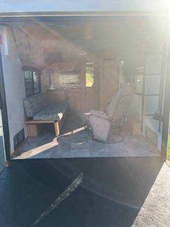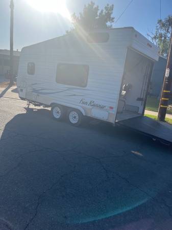 16 ft. Carson toy hauler fun runner, 1/2 ton can tow. Will fit a two seater Manz buggy or 2 motorcycles. 2 six volt batteries. Tv/dvd. Portable ac. Microwave. New chair. Good tires, mounted spare. Stove, water heater, heater, refrigerator works good. 858-740-636two.