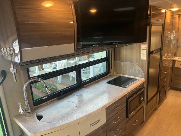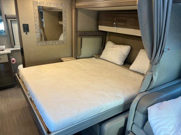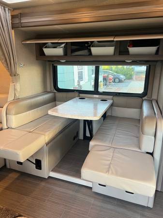 It’s the best we have owned out of five! Great layout with lots of room, queen bed, room for four adults or three adults and three children. Lots of room in kitchen and dinette and still have a couch, Swivel front seats and overhead storage. The bathroom is very comfortable for a shower and cabinets. Large refrigerator. Plenty of storage. Very comfortable to drive and park. Outside shower and outside gas hookup for BBQ. Has generator and solar!!! We have done mostly off grid camping at wineries, parks and farms with no power problem. Fully furnished with all the needed supplies! Totally ready to go. Just add food and clothes.