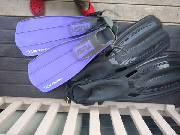 1. $70, costs $150, 11-12 Sherwood Triton Long Fins Scuba Diving Snorkeling Spearfishing fin set Large/X-Large