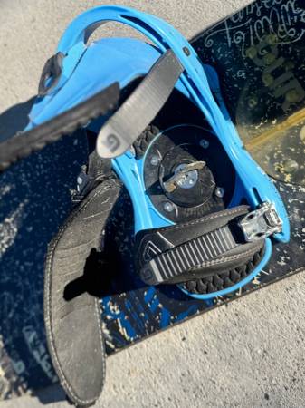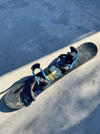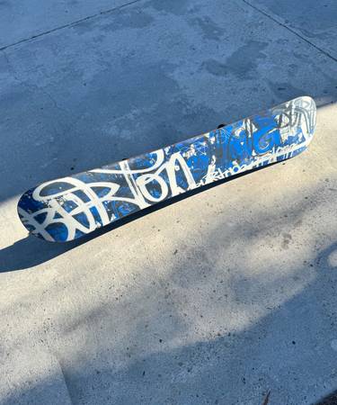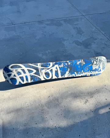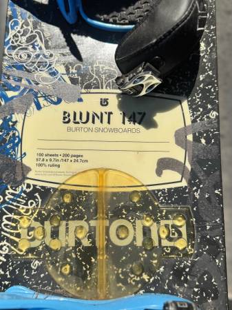 Burton Blunt 147 snowboard comes with size Large Burton bindings, ready to hit the slopes. It features eye catching graffiti art on the base and a unique composite school notebook theme on the top, all in a sleek black, blue, and white colorway. A great all around board for riders who appreciate both performance and standout style.