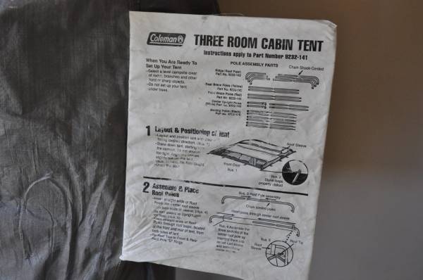 Nice Coleman brand three room cabin tent complete with poles and storage bag. Seldom used, in great shape. I think it’s about 8 x 10 feet. (it might be bigger). I don't have photos of it set up, and I don't have room at my house to set it up for photos. We’re old and our camping days are over, so someone else should be using this tent.