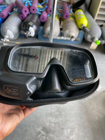Great scuba dive mask with built in hands free heads up display HUD and computer with transmitter that connects to your 1st stage regulator to show your air pressure, depth, bottom time, NDC, and other info. Perfect for tech divers or low visibility conditions where you can't see your gauges. Comes with transmitter, just installed fresh batteries. Everything works great.