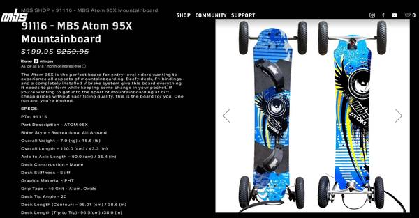 The Atom 95X is the perfect board for entry-level riders wanting to experience all aspects of mountainboarding. Beefy deck, F1 bindings and a completely installed V brake system give this board everything it needs to perform while keeping some change in your pocket. If you're wanting to get into the sport of mountainboarding at dirt cheap prices without sacrificing quality, this is the board for you. One run and you're hooked.