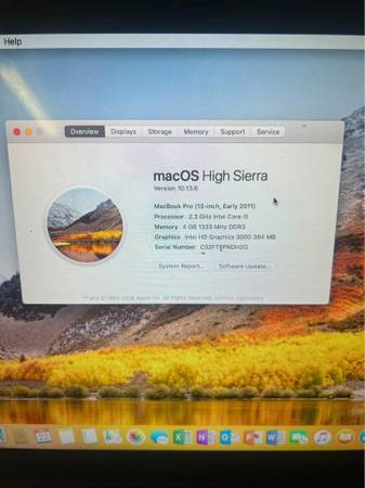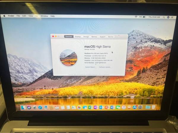 13” MacBook Pro 2.3Ghz i5 4GB 320GB 2011. It has been factory reset and fresh osx High Sierra and Bonus Microsoft Office 2016 (Word, Powerpoint, Excel, Outlook) installed. Ready for school, work or play. Comes with Charger. Battery holds some charge.