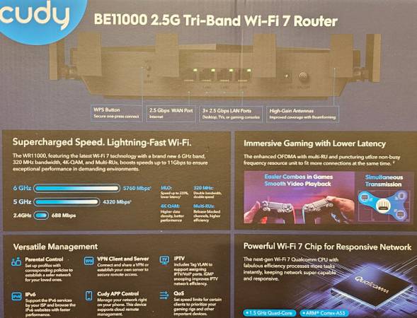 - Features cutting-edge Wi-Fi 7 technology, delivers speeds of 5760 Mbps on 6GHz, 4320 Mbps on 5GHz, and 688 Mbps on 2.4GHz