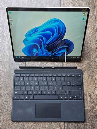 Microsoft Surface Pro 8 in fair condition. The screen glass is cracked in the upper right corner. The damage does not affect touchscreen operation. The computer works perfectly.