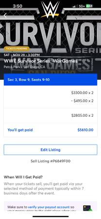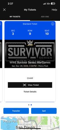2 tickets to WWE Survivor Series on November 29, 2025 at Petco Park!!! Section 3 Row 9 seats 9 and 10. GREAT seats. Face value is over $3k each, selling for $2,500 each. Ticketmaster E-Tickets will...