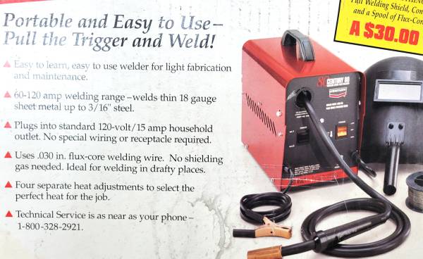 Xlnt condition lightly-used Century 80 flux-core (no gas) 60-120amp 120v wire-feed welder. Lincoln Electric quality! Portable/handy. Plugs into 110 outlet. Includes replacement tips, heavy duty welding gloves, and brand-new/unused/in-the-box auto-darkening large-view welding helmet.