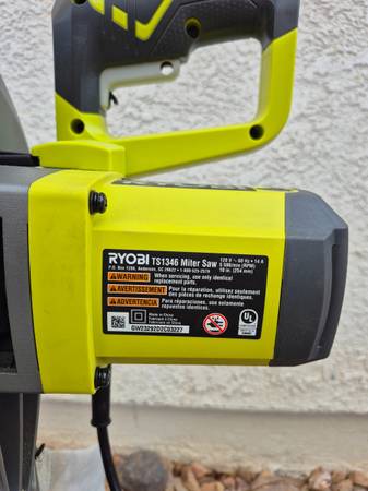 Ryobi TS1346 10" Compound Miter Saw in excellent condition. With LED cutline shadow. It includes: 24T Carbide-Tipped blade, wrench, dust bag, clamp, and user manual. Cash only.