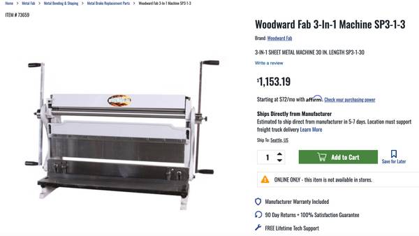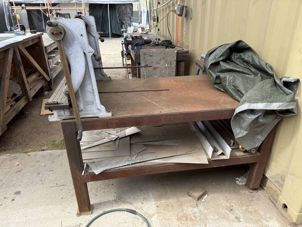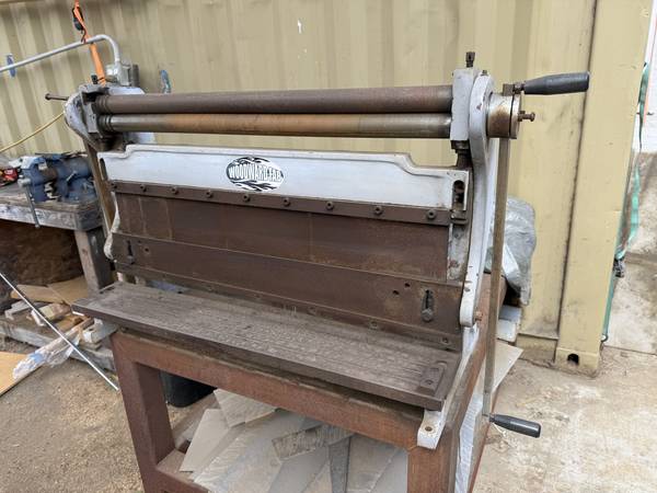 30" Metal brake, shear and roller in one compact machine. Includes sturdy steel table and separate bead roller. Needs a little cleanup and adjustment but well worth the effort at this price. Over $1400 new without the table and bead roller. Shop is closing and no longer needed. Can help load with forklift onto trailer or truck.