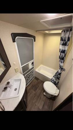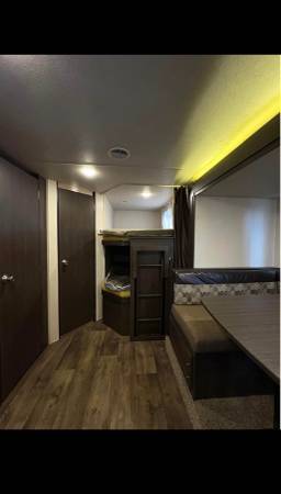3 burner cooktop, oven, microwave and 1 stainless steel sink. Private Master bedroom with queen size bed and plenty of storage. Slide out in the main living area with loveseat (futon) and “U” custom made booth with dining table ( bed as well ). 2 full sized Bunk bed set-up with privacy and power/lights for each bed. Full bath containing shower, toilet, vanity, sink and medicine cabinet.