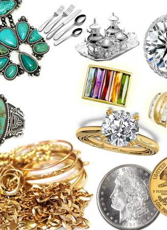 I buy Coins, Jewelry, GOLD, Silver, Pocket Watches, Platinum, Sterling Silverware, Sterling Platters, Cups, Plates, Pitchers, and Bowls, Scrap jewelry, Art Bars, silver and gold Rounds, diamonds, and Native American and Mexican Silver Jewelry. I buy gold and silver in any form. Slabbed coins, Estates, Costume Jewelry, Proof and Mint Sets, Engagement Rings, Wedding Rings, Gold-filled, chains, earrings, tie clips, belt buckles, bracelets, squash blossoms, settings, two-finger rings, cuffs, pearls, Breguet, Elgin, Van Cleef and Arpels, Tiffany, Patek Philipe, Geneve, Faberge, 9k, 10k, 12k, 14k, 16k, 18, 21k, 22k, 24k, dental gold, Rhodium, Palladium, Iridium, Jewelry and Watchmaking tools,