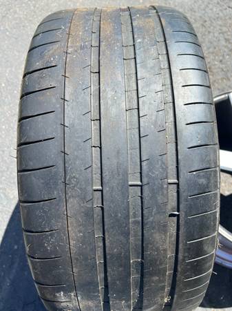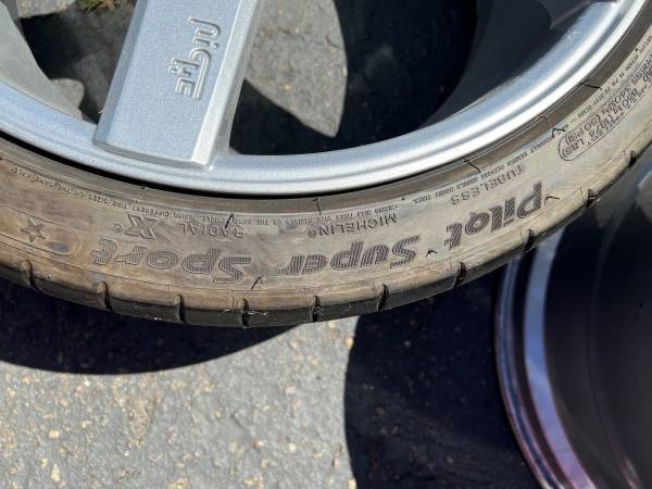 The 5th wheel with the 275/35 Michelin Super Sport tire (in excellent condition) is pristine, also powder-coated, and has NOT been plasti-dipped (it was a full-sized “spare” and has its original bright silver center cap). Please examine all pics very thoroughly. You can take all (5) of them for $300. If you only want the single, full sized “spare” that includes the tire: $300. If you just want the (4) wheels: $200. Must pick them up - no delivery.