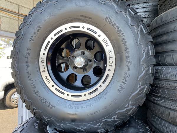 THESE ARE 35x12x50x15 BFGOODRICH ALL TERRAIN T/A L/T TIRES AND ION ALLOY WHEELS, they are for 1700.00 DOLLARS FOR THE SET OF FOUR TIRES AND WHEELS, WHEEL SIZE IS 5ON 5 4.5 PATTERN SIZE. SSTIRESHOP. show contact info
